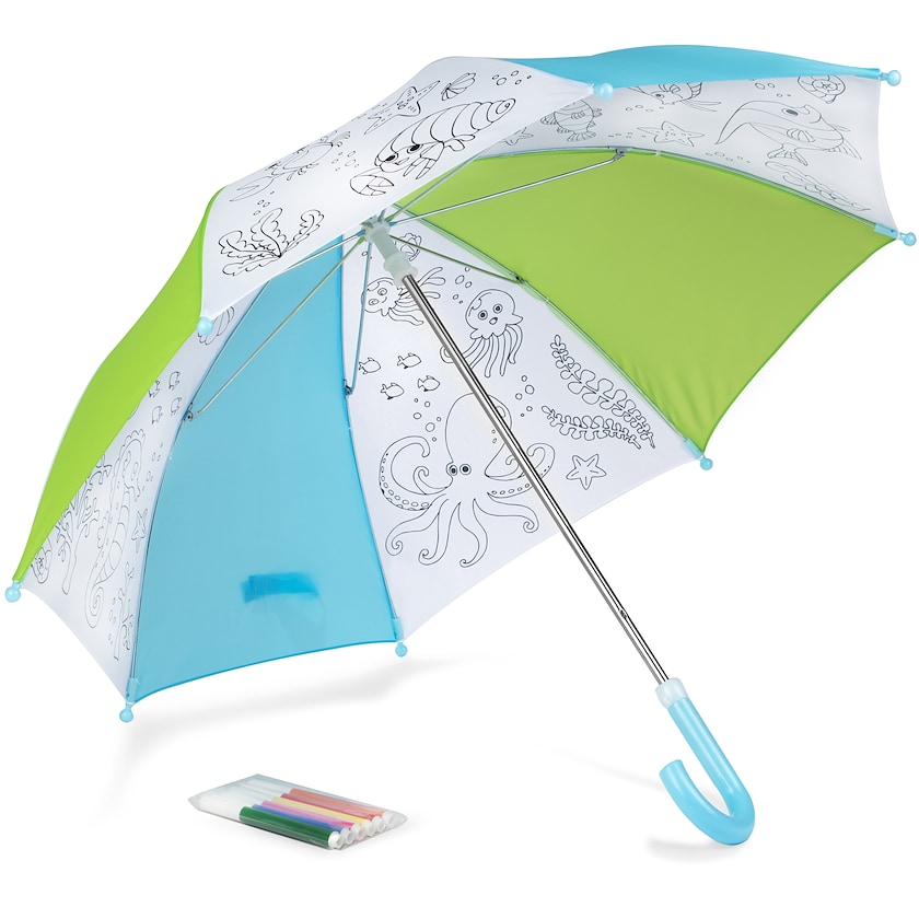 Bemalbarer Kinderschirm. 6 Filzstifte im Lieferumfang enthalten. Der Regenschirm ist manuell zu öffnen. Garantiert sowohl trockene als auch glückliche Kinder!