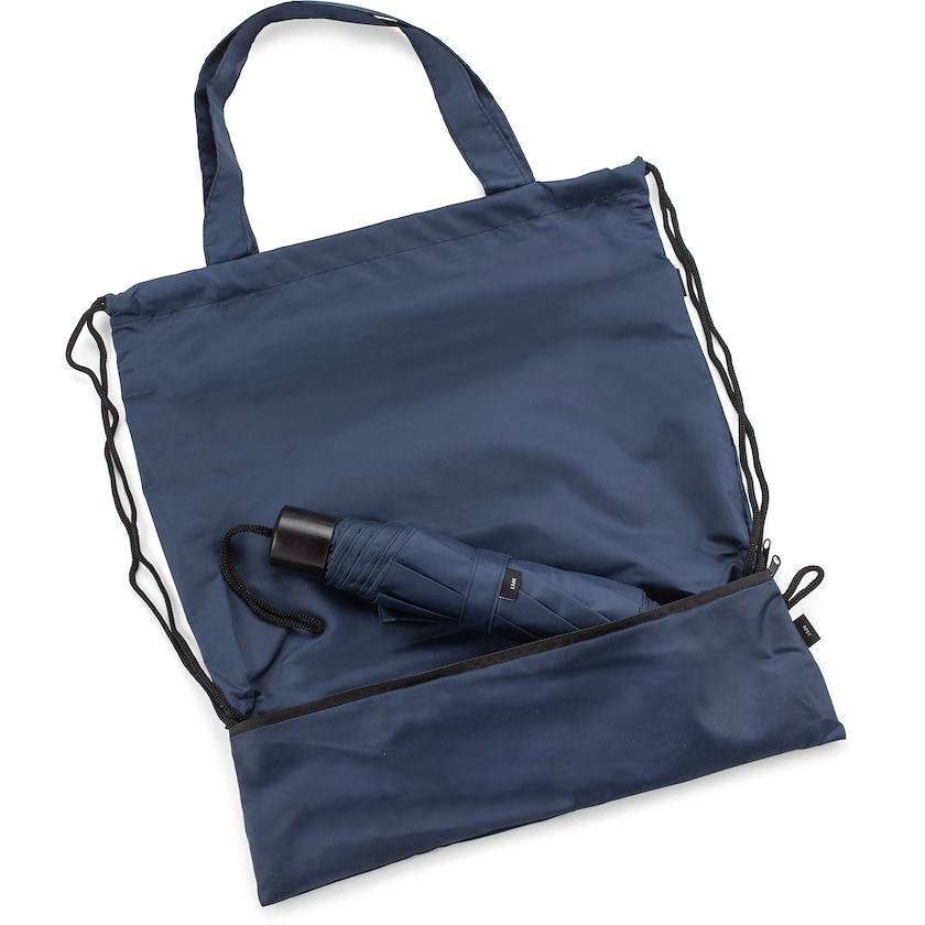 Umweltfreundliches Set mit Regenschirm und Stofftasche. Sowohl der Regenschirm als auch die Stofftasche bestehen aus rPET, also recycelten PET-Flaschen. Am Boden der Stofftasche befindet sich eine Aufbewahrungstasche für den Regenschirm. Wenn der Stoffbeutel nicht in Gebrauch ist, wird er gefaltet und nimmt nur minimalen Platz ein. Gedruckt wird entweder auf den Schirm oder auf die Stofftasche. Die Stofftasche hat die Maße 41 x 37 cm und ist mit maximal 3 kg belastbar. Der Regenschirm ist manuell zu öffnen.