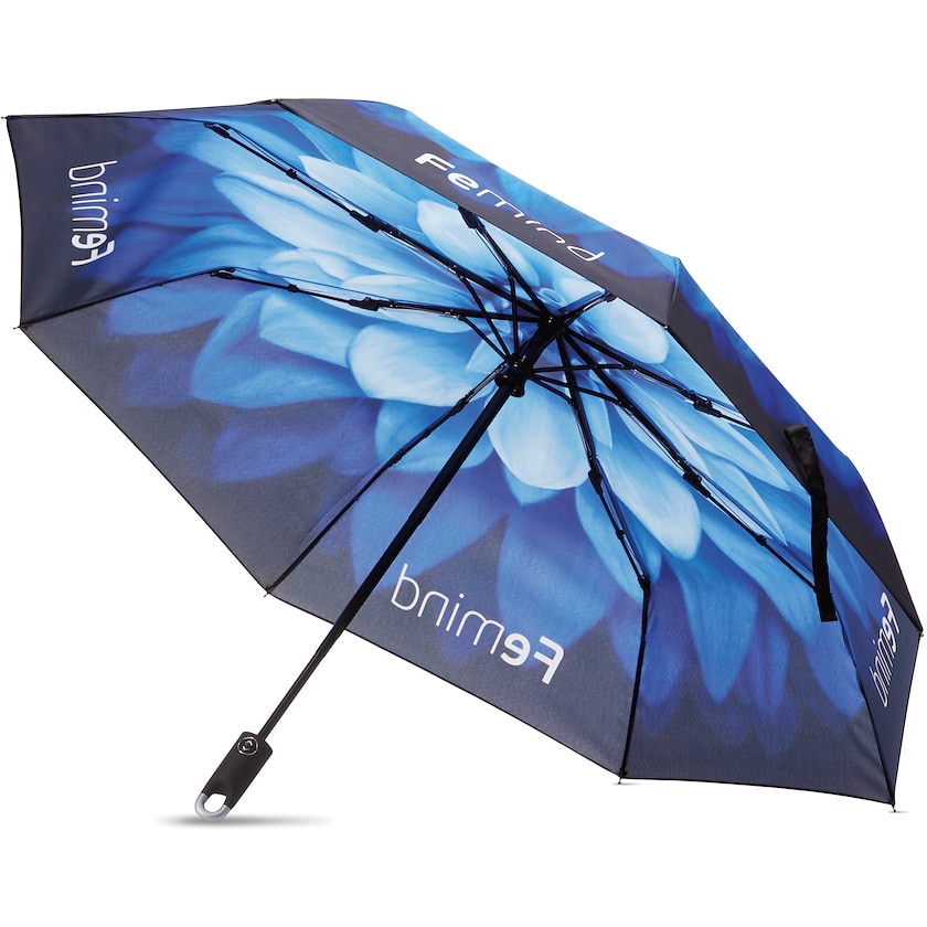 Umweltfreundlicher Kompaktschirm mit Stoff, der ganz nach Ihren Wünschen bedruckt wird. Ravenna hat einen einzigartigen Griff, mit dem der Regenschirm beispielsweise am Rucksack oder Koffer befestigt werden kann. Der Schirm hat drei Segmente und eine verstärkte Konstruktion mit Fiberglasrippen. Das Öffnen und Schließen erfolgt automatisch. Der gesamte Stoff wird nach Ihren Wünschen bedruckt und anschließend auf die Schirmkonstruktion genäht. Wird mit einem Etui geliefert, das dem Design des Regenschirms entspricht. Der Stoff besteht aus rPET, also recycelten PET-Flaschen.