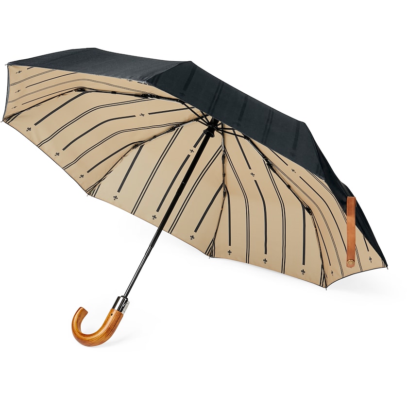 Eleganter Regenschirm im einzigartigem Design. Der Stoff besteht aus recyceltem PET und verfügt über ein stilvolles Innenfutter, das den eleganten Eindruck verstärkt. Die Schirmstange und die Rippen bestehen aus Fiberglas und der Griff besteht aus Verbundholz. Automatisches Öffnen und manuelles Schließen.