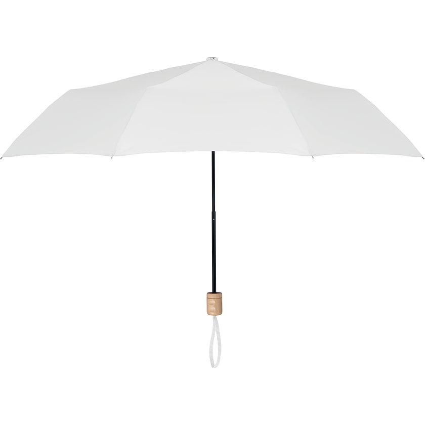 Umweltfreundlicher Kompaktregenschirm, der ab 10 Stück bestellt werden kann. Der Regenschirm hat drei Segmente und besteht aus rPET, also recycelten PET-Flaschen. Die Rippen sind schwarz und der Handgriff naturfarben. Manuell zu öffnen und zu schließen.