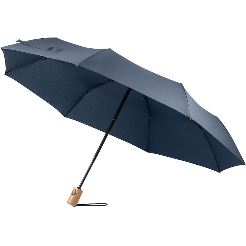 Umweltfreundlichen Kompaktregenschirm bedrucken. Der Stoff besteht aus rPET, also recycelten PET-Flaschen. Die Schienen sind aus Fiberglas und der Griff aus Holz. Das Öffnen und Schließen erfolgt automatisch.