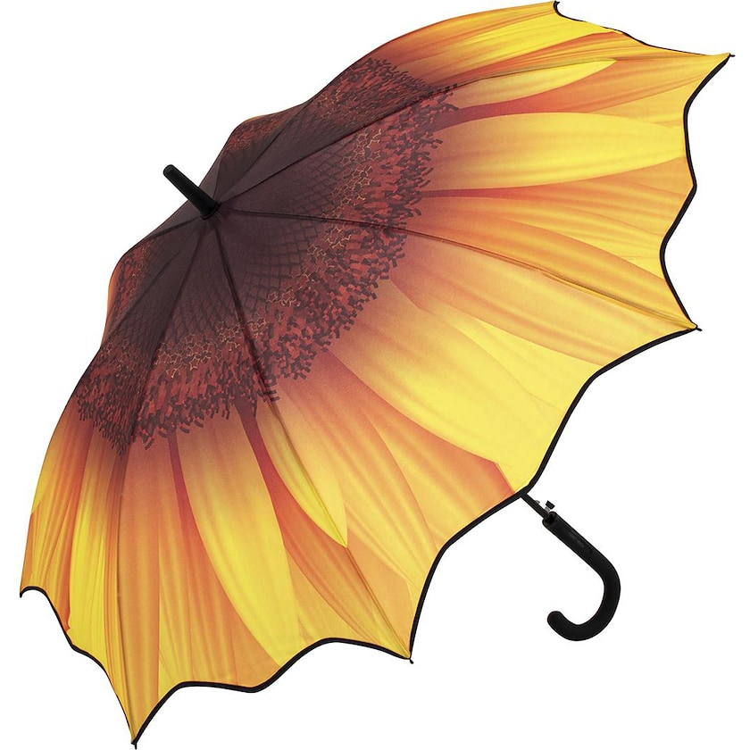 Regenschirm mit aufgedrucktem Motiv einer Sonnenblume oder eines Blattes. Nicol hat eine verstärkte sturmsichere Konstruktion dank Fiberglasgerippe und einem Regenschirmstab aus verzinktem Stahl.