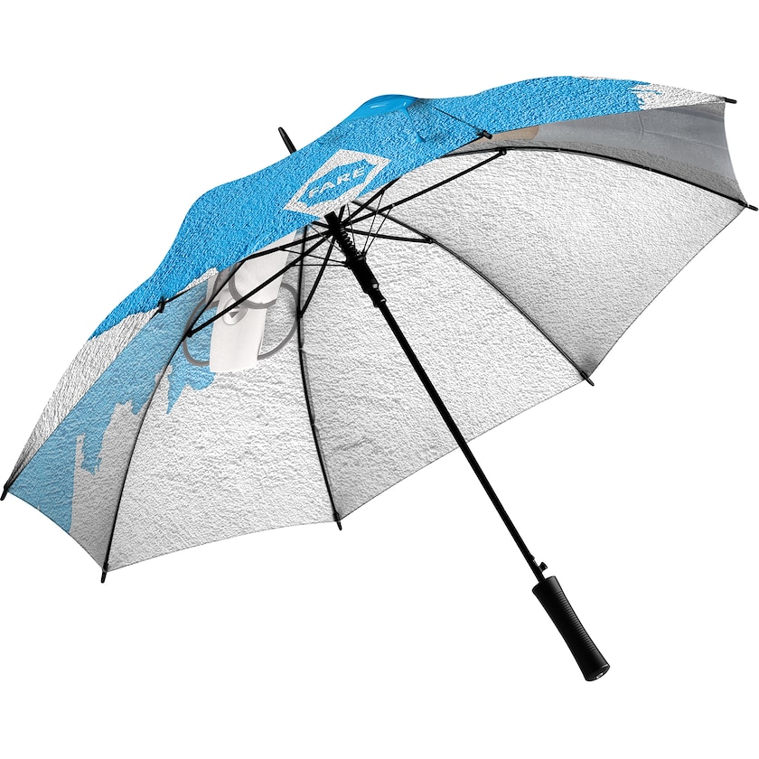 Hochwertigen Regenschirm bedrucken über die gesamte Oberfläche. Der Regenschirm hat eine verstärkte Konstruktion, die selbst starken Windböen standhalten kann. Die Streben bestehen aus Fiberglas und die Schirmstange aus verzinktem schwarzem Stahl. Die gesamte Stoffoberfläche wird ganz nach Ihren Wünschen bedruckt. Die Lieferzeit ist länger, da die Schirme auf Bestellung direkt im Werk gefertigt werden.
