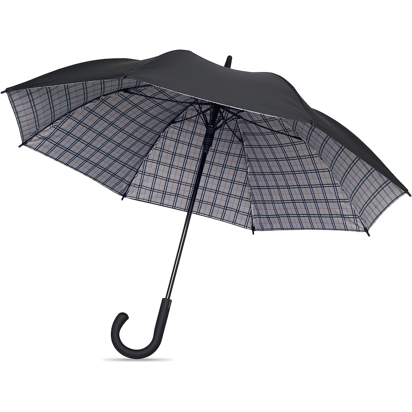 Sturmfester Regenschirm mit kariertem Innenstoff. Die Rippen bestehen aus Fiberglas und der Griff ist gummiert. Öffnet automatisch.