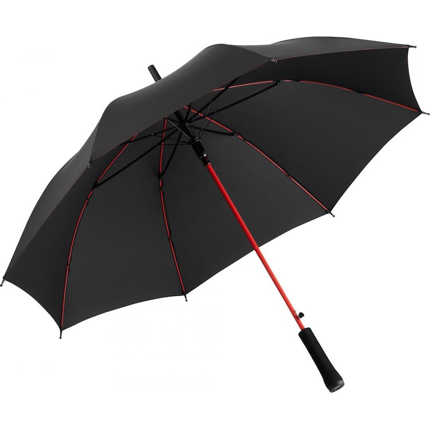 Sturmfesten Regenschirm bedrucken mit kontrastfarbenen Details. Die Streben bestehen aus Fiberglas und die Schirmstange aus Stahl. Der Schirmstoff besteht aus recyceltem Polyester. Ein hochwertiger Regenschirm mit viel Charakter.