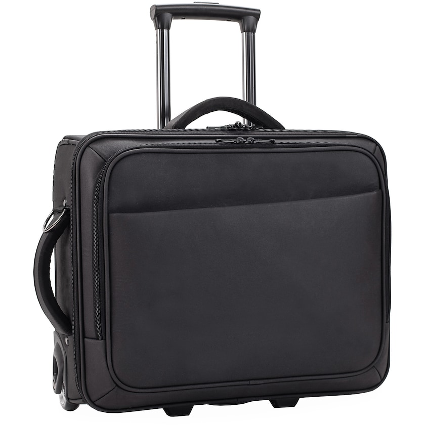 Stilvoller Handgepäckskoffer von hoher Qualität. Im Inneren befindet sich ein gepolstertes Fach für einen 17 Zoll Laptop und ein gepolstertes Fach für ein Tablet. Auf der Vorderseite befindet sich eine Tasche für kleinere Gegenstände. Kommt mit einem abnehmbaren Schulterriemen. Die Tasche hat zwei Rollen.