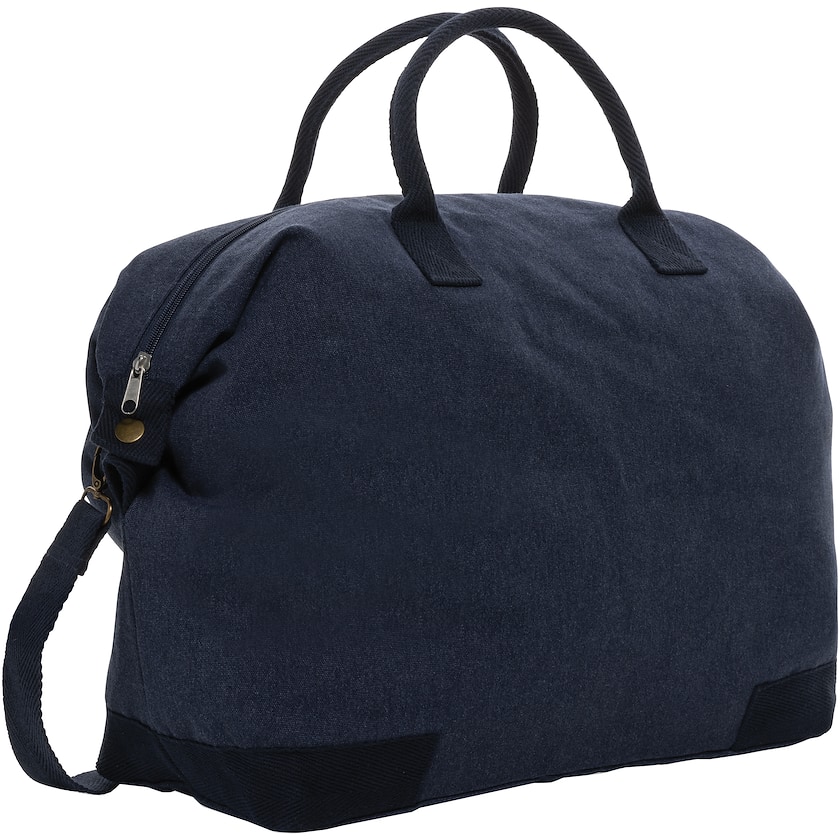 Wochenendtasche mit Canvas-Stoff aus recycelter Baumwolle. Die Tasche verfügt über ein Hauptfach und ist mit einem Schultergurt ausgestattet. Die Details sind aus aufwendigem Messing gefertigt.