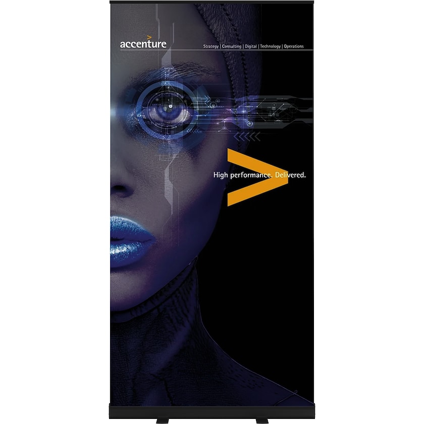 100 cm breites Rollup im schwarzen Design. Die Konstruktion besteht aus pulverbeschichtetem, schwarz eloxiertem Aluminium. Der Roll-Up-Stoff ist vom Typ Blockout PET 330 g/m², ein erstklassiger Stoff mit einer weichen, matten Oberfläche, die Licht blockiert und eine perfekte Farbwiedergabe bietet. Der Druck erfolgt digital mit fortschrittlicher UV-LED-Technologie und ökologischen Farben aus europäischer Produktion. Der Stoff hat die Maße 200 x 100 cm. Eine praktische Tasche ist im Lieferumfang enthalten. 1 Jahr Garantie. Das Roll-Up ist identisch mit dem Standardmodell, jedoch schwarz.