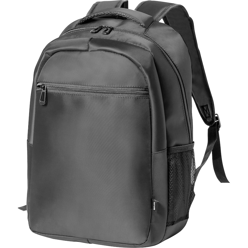 Computerrucksack bedrucken aus recyceltem Nylon. Im Inneren befindet sich ein gepolstertes Fach für einen 15 Zoll Laptop. Auf der Vorderseite befindet sich eine kleine Tasche mit Reißverschluss. Auf der Rückseite befindet sich ein Trolley-Gurt.