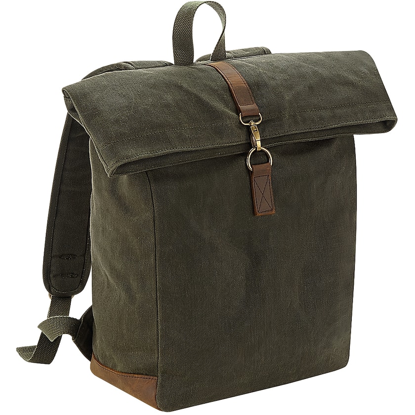 Laptoprucksack aus gewachstem Baumwollstoff mit Details aus echtem Leder. Innen befindet sich ein gepolsteres Fach mit Platz für die meisten Laptops bis 15,6". Das Hauptfach hat einen Reißverschluss und die Rückseite ist gepolstert.