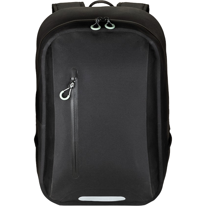 Wasserdichter Laptoprucksack. Im Inneren befindet sich ein gepolstertes Fach für einen 15-Zoll-Laptop, das herausgenommen werden kann. Die heat-sealed Nähte (verschweißte Nähte) halten Feuchtigkeit effektiv ab. Vorne und an den Seiten befinden sich Taschen. Nur 1-farbiger Druck möglich.