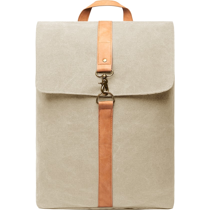 Eleganter Computerrucksack aus umweltfreundlichem Canvas-Stoff. Im Inneren befindet sich ein gepolstertes Fach für einen 15 Zoll Laptop. Der Stoff besteht aus 62% recycelter Baumwolle und 34% normaler Baumwolle. Der Rucksack hat schöne Details aus Kunstleder und Metall.