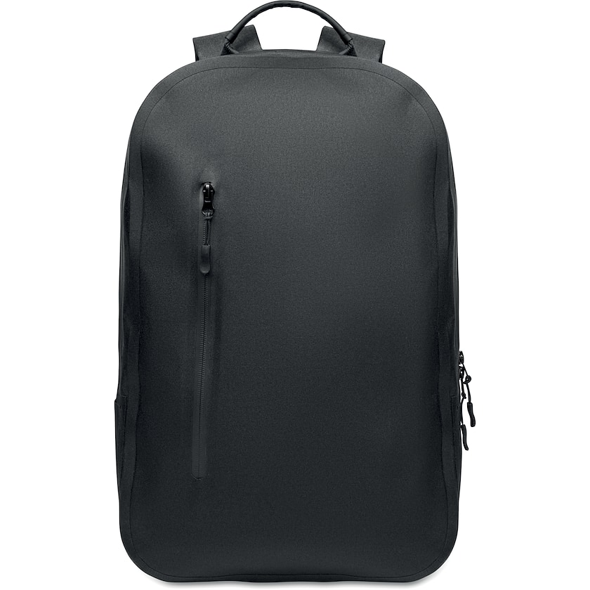 Im Inneren befindet sich ein gepolstertes Fach für einen 16-Zoll-Laptop. Das Außenmaterial besteht aus umweltfreundlichem rPET (recyceltes PET) und ist wasserabweisend. Auf der Vorderseite befindet sich eine Tasche mit Reißverschluss.