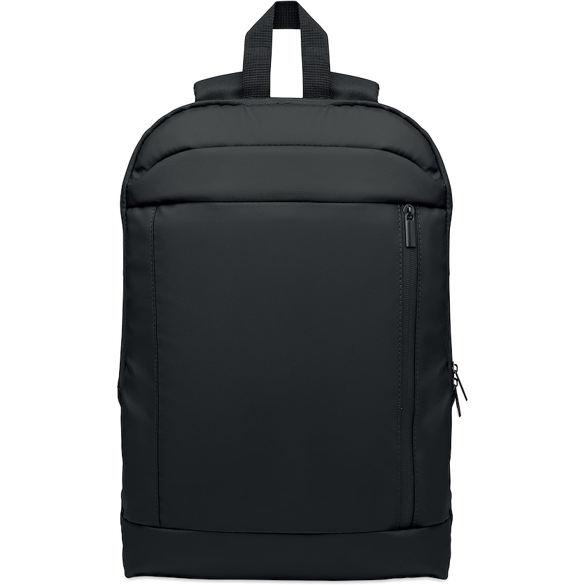 Erweiterbarer Laptop-Rucksack aus recyceltem Material. Im Inneren befindet sich ein gepolstertes Fach für einen 16-Zoll-Laptop. Auf der Vorderseite ist eine Reißverschlusstasche für kleinere Gegenstände angebracht. Auf der Rückseite befindet sich eine Befestigung, mit der der Rucksack an einem Koffer befestigt werden kann.