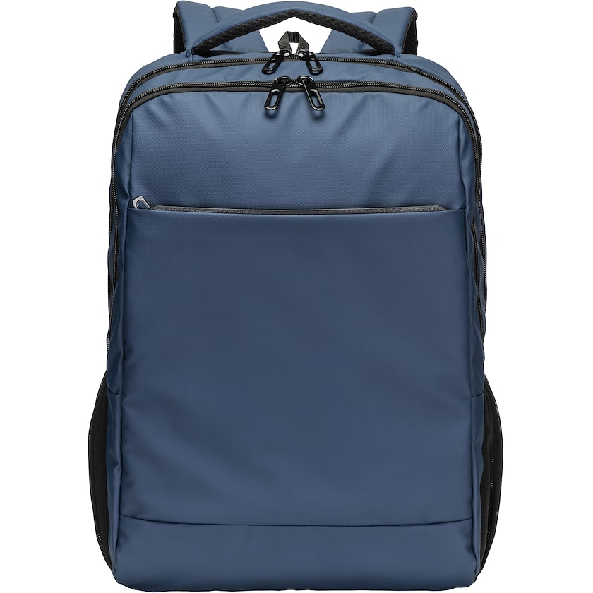 Moderner Computerrucksack aus recyceltem Material. Im Inneren befindet sich ein gepolstertes Fach für einen 15-Zoll-Laptop. Auf der Vorderseite ist eine große Reißverschlusstasche angebracht und es gibt Seitentaschen für Wasserflaschen. Die Rückseite und die Schultergurte sind bequem gepolstert. Der Rucksack kann an einem Trolley befestigt werden.