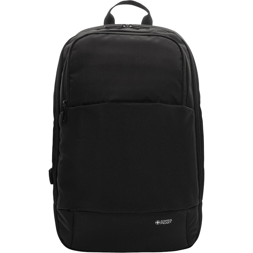 Umweltfreundlicher Computerrucksack von Swiss Peak. Im Inneren befindet sich ein gepolstertes Fach für einen 15,6 Zoll Laptop. Der Rucksack hat angenehm gepolsterte Schultergurte.