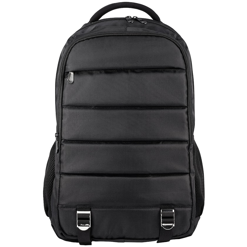 Hochwertiger Rucksack, ganz in schwarz. Vorne befinden sich zwei Fächer mit Reißverschluss. An den Seiten befinden sich Netzfächer. Die Schulterriemen sind extrabreit und für mehr Tragekomfort belüftet.