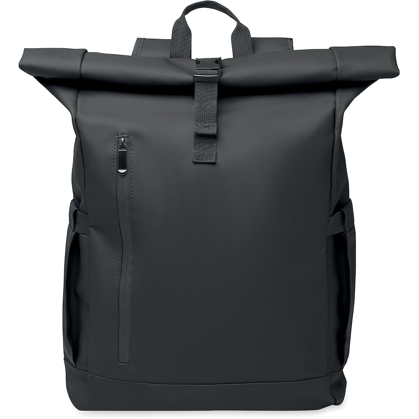 Umweltfreundlicher Rolltop-Rucksack mit wasserabweisender Oberfläche. Im Inneren befindet sich ein Fach für einen 15-Zoll-Laptop. Die Rückseite und die Schultergurte sind gepolstert und mit Mesh-Gewebe versehen.
