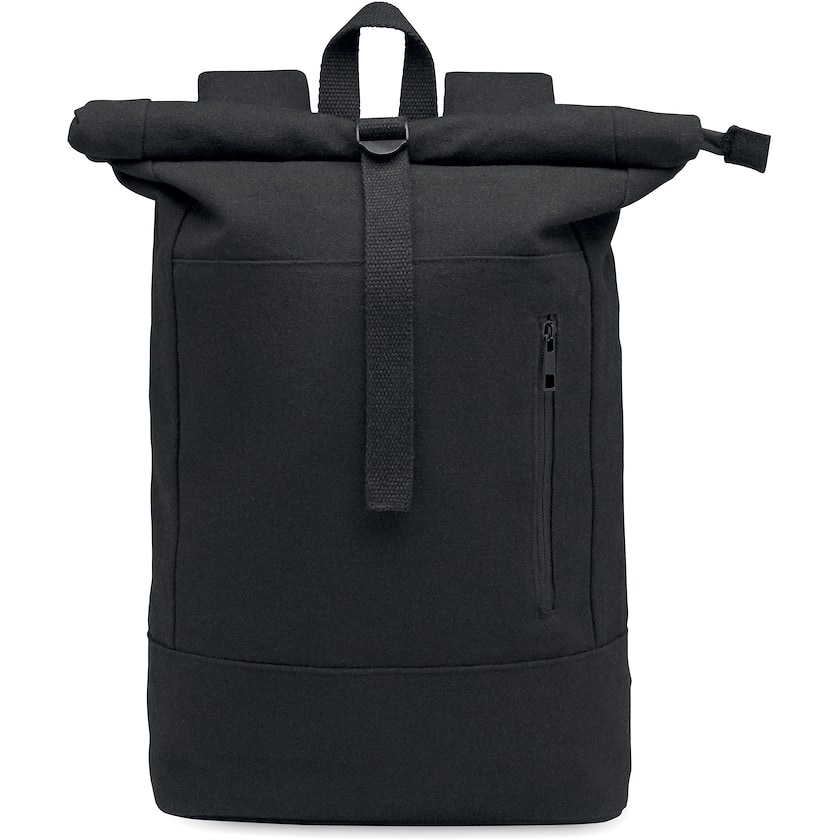 Computerrucksack aus recyceltem Material. Im Inneren befindet sich ein Fach für einen 15-Zoll-Laptop. Rücken- und Schultergurte sind angenehm gepolstert. Vorne befindet sich eine Tasche mit Reißverschluss.