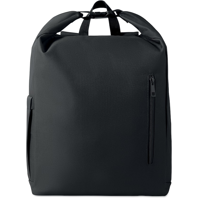 Roll-Top-Rucksack aus rPET Mit gepolstertem Fach für einen 15-Zoll-Laptop, vorderer Reißverschlusstasche und elastischer Seitentasche.