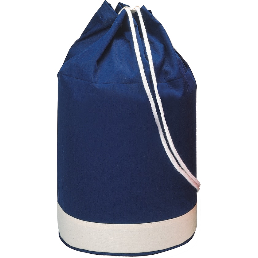 Seesack aus strapazierfähigem Baumwollstoff. Der Seesack fasst 6 Liter und ist mit weißen Schnüren ausgestattet. Ein Seesack, der an das Meer und die Seefahrt erinnert.