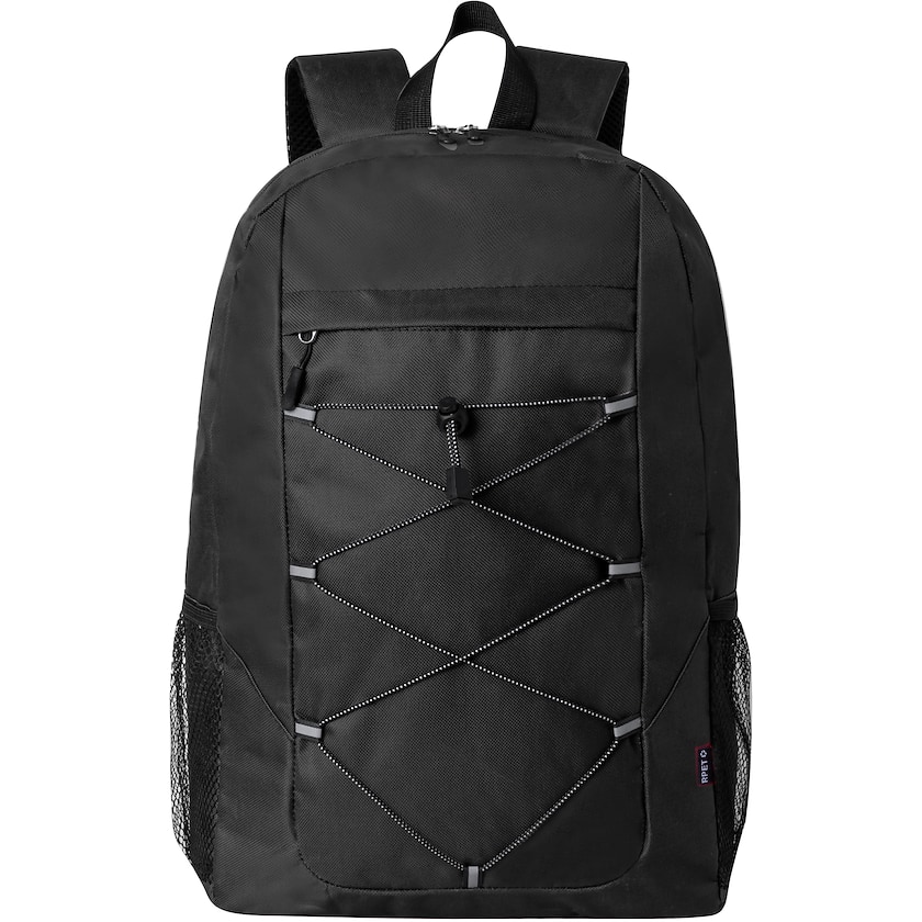 Umweltfreundlicher Rucksack zum günstigen Preis. Rumpf besteht aus rPET, also recycelten PET-Flaschen. Vorne befindet sich eine Tasche mit Reißverschluss. Der Rücken und die Schultergurte sind gepolstert. An den Seiten befinden sich Netztaschen.