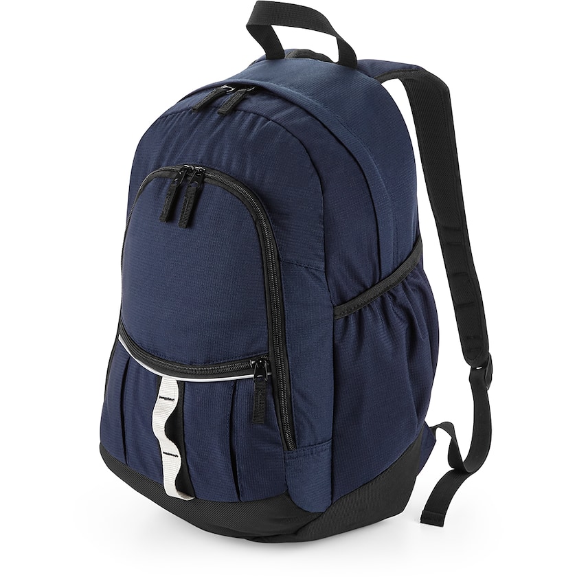 Hochwertiger Rucksack mit Reflektor an der Vorderseite. Die Schultergurte sind gepolstert und die Rückwand ergonomisch geformt. An den Seiten befinden sich Taschen für z.B. Wasserflaschen.