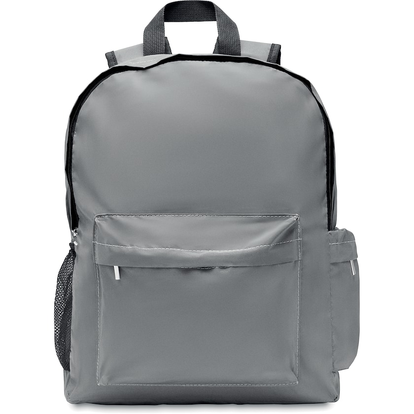 Rucksack mit stark reflektierendem Stoff. Rücken, Schultergurte und Unterseite sind gepolstert. Im Inneren befindet sich ein Fach für einen 15-Zoll-Laptop. Auf der einen Seite befindet sich eine Tasche mit Reißverschluss und auf der anderen Seite eine Netztasche.