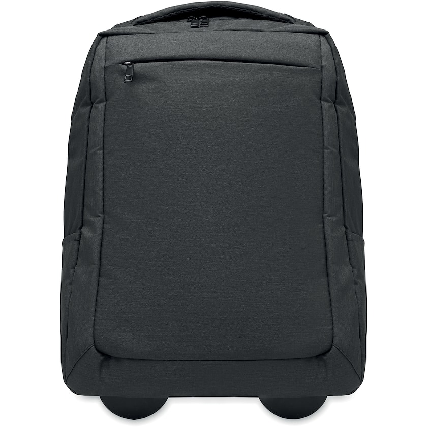 Trolley-Rucksack aus recyceltem Material. Im Inneren befindet sich ein gepolstertes Fach für einen 15-Zoll-Laptop. Auf der Vorderseite befindet sich eine Reißverschlusstasche und an den Seiten zwei kleinere Taschen.