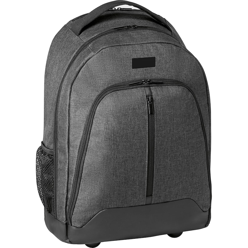 Trolleyrucksack aus wasserdichtem Stoff. Im Inneren befindet sich ein gepolstertes Fach für einen 15,6-Zoll-Laptop. Rücken- und Schultergurte sind gepolstert. Die Kennzeichnung kann entweder mit Druck auf dem Rucksack oder mit Lasergravur auf der Metallplatte des Rucksacks erfolgen.