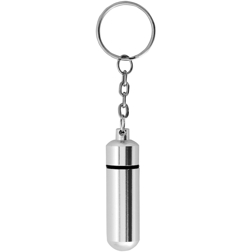 Schlüsselanhänger mit kleiner Pillendose aus Aluminium. Smarte Pillendose für unterwegs. Markierung erfolgt mit Lasergravur.