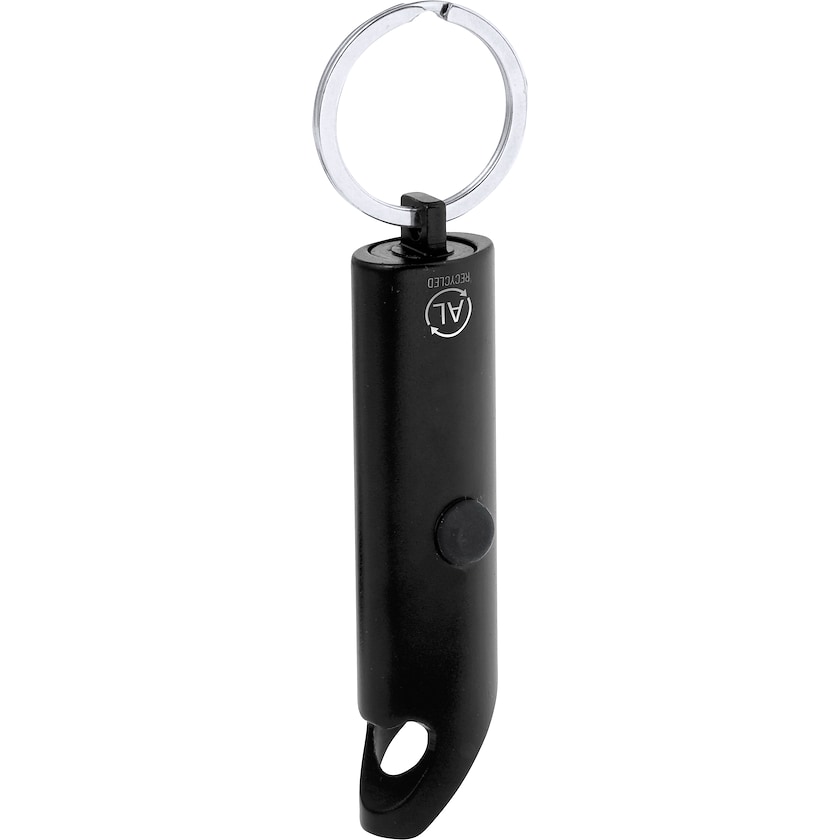 Kleiner LED-Schlüsselanhänger aus recyceltem Aluminium. Funktioniert auch als Flaschenöffner. Der Druck kann maximal zweifarbig erfolgen.