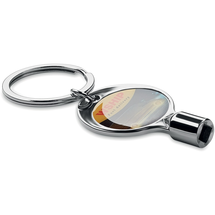 Elementschlüssel (Heizkörperschlüssel) mit Schlüsselanhänger. Der Schlüsselanhänger lässt sich digital auf einer Seite mit Ihrem Logo bedrucken und wird mit einer schützenden Epoxidschicht versehen. Die Schlüsselanhänger werden einzeln in Seidenpapier verpackt geliefert. Ein perfekter Werbeartikel, zum Beispiel für Sanitärunternehmen oder Immobilienfirmen.