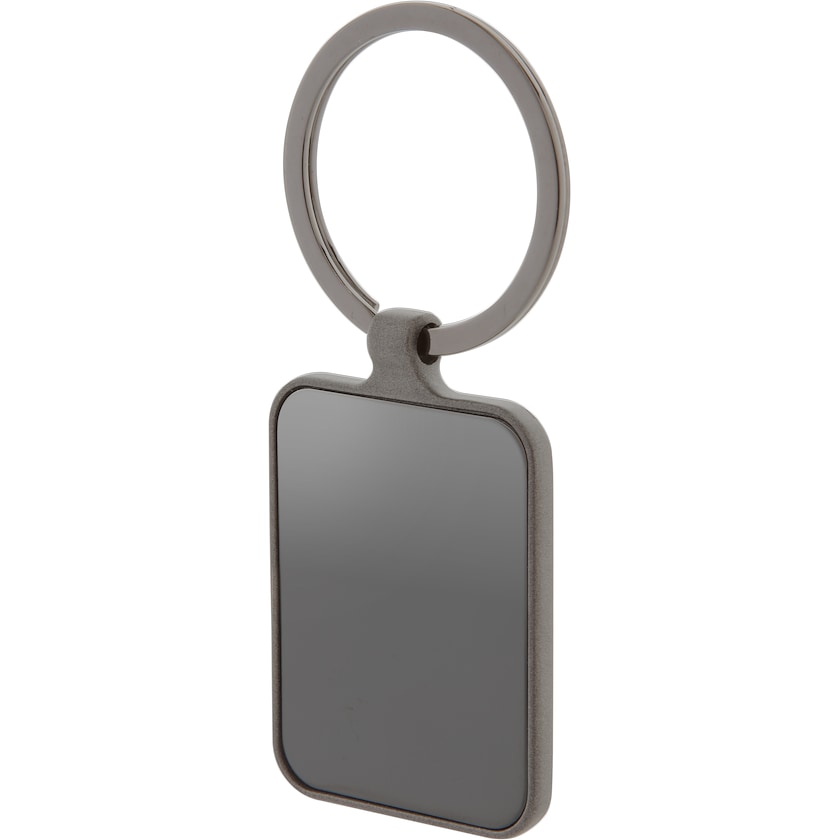 Rechteckiger Schlüsselanhänger aus Metall mit Gun-Metal-Finish. Beide Platten sind glänzend und der Rest des Schlüsselanhängers ist matt. Lieferung in einer schwarzen Geschenkbox.