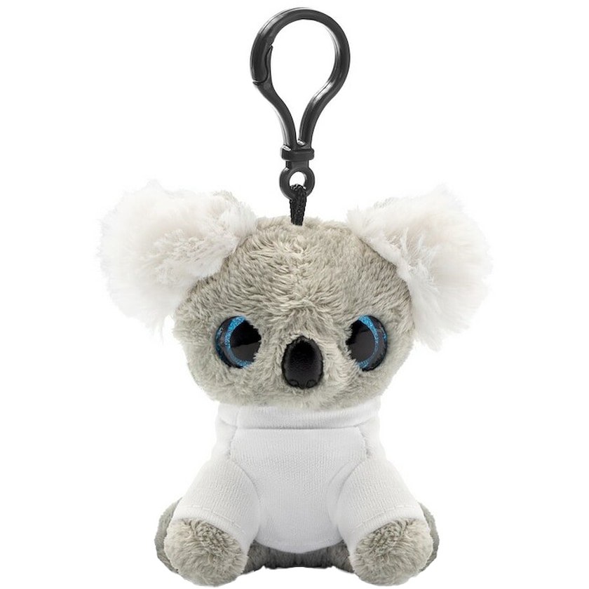 Süßer Koalabär mit weißem T-Shirt und schwarzem Plastikhaken. Der Plastikhaken eignet sich perfekt zum Befestigen an beispielsweise einer Tasche oder einem Rucksack.