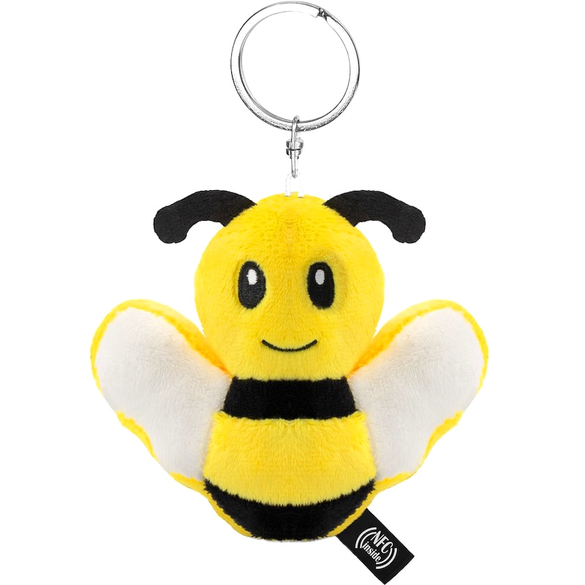 Eine freundliche Biene mit Schlüsselring. Sting wird aus recycelten PET-Flaschen (rPET) hergestellt. Das Etikett ist mit einem NFC-Chip ausgestattet, der über die NFC-Technologie mit mobilen Geräten kommunizieren kann. So kann beispielsweise ein Link zu einer Webseite vom NFC-Chip an ein Mobiltelefon übermittelt werden.