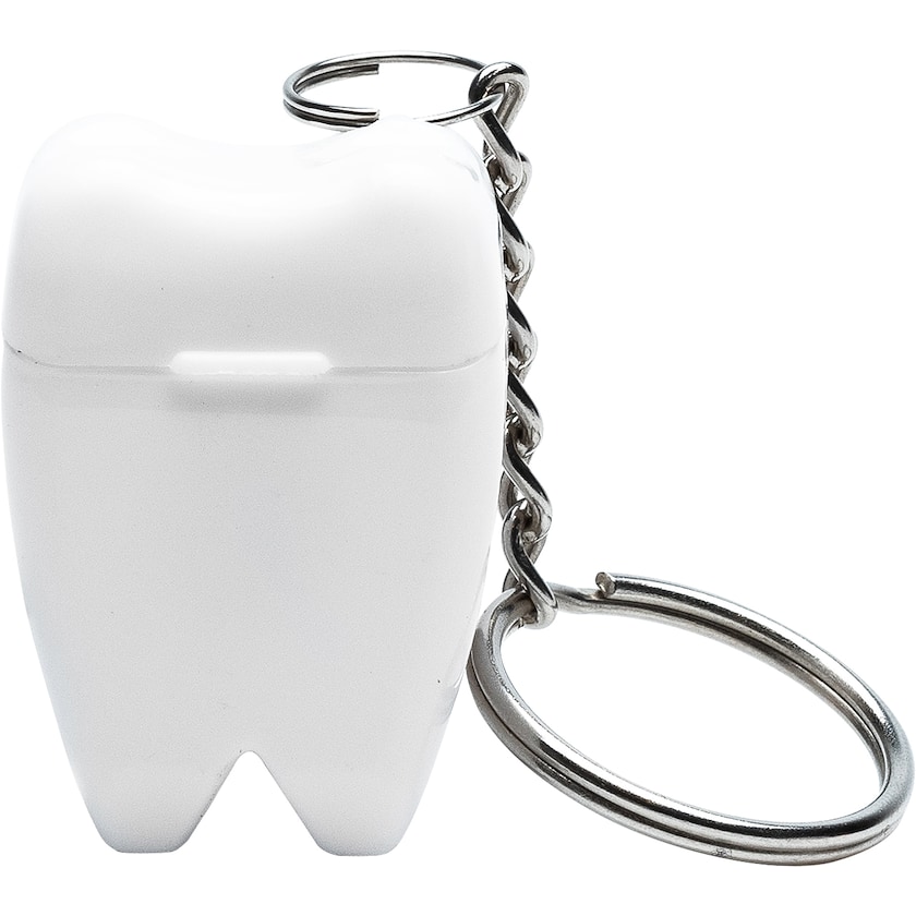 Schlüsselanhänger in Zahnform mit 5 Metern Zahnseide. Sorgt für saubere Zähne, egal wo Sie sich befinden. Ein ausgezeichnetes Werbeprodukt für Zahnärzte.
