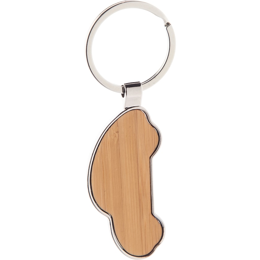 Schlüsselanhänger aus Metall und Bambus in Form eines Autos. Einzeln verpackt in einer naturfarbenen Pappschachtel.