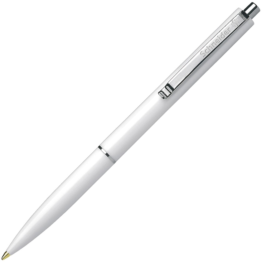 Günstiger, aber hochwertiger Kugelschreiber von Schneider. Stift aus blankpoliertem Kunststoff mit Details aus Metall. Stift mit blauen Details und blauer Tinte und Stift mit schwarzen Details und schwarzer Tinte.