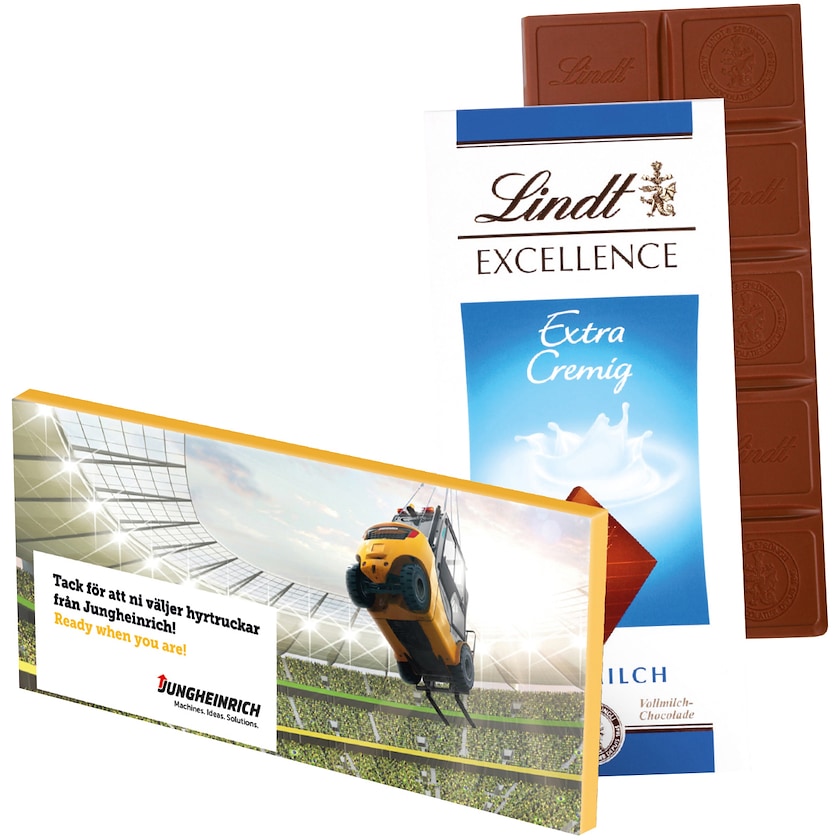 100 Gramm Schokolade Lindt Excellence mit Verpackung im 4-Farbdruck. Wählen Sie aus 4 Geschmacksrichtungen. Schokolade ist in Originalverpackung, die sich in bedruckbarer Pappverpackung befindet.