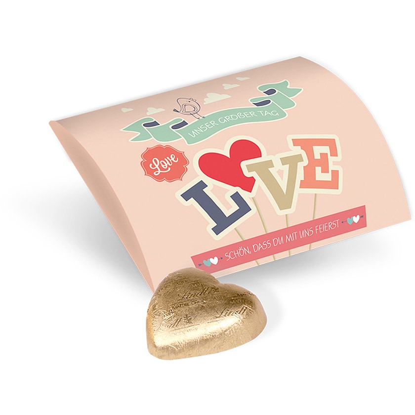 Lindt Schokoladenherzen ineiner Pappverpackung mit Ihrem Logo. Die Verpackung wird innen und außen nach Ihren Wünschen bedruckt. Wählen Sie zwischen goldfarbener und roter Folie.