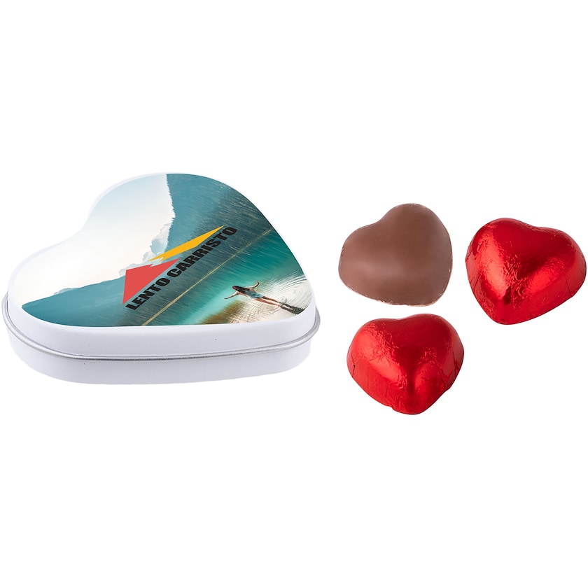 Drei Schokoladenherzen in roter Folie in einer herzförmigen Metallbox. Der gesamte Deckel der Metallbox wird nach Ihren Wünschen bedruckt. Ein herzliches und sehr leckeres Geschenk!