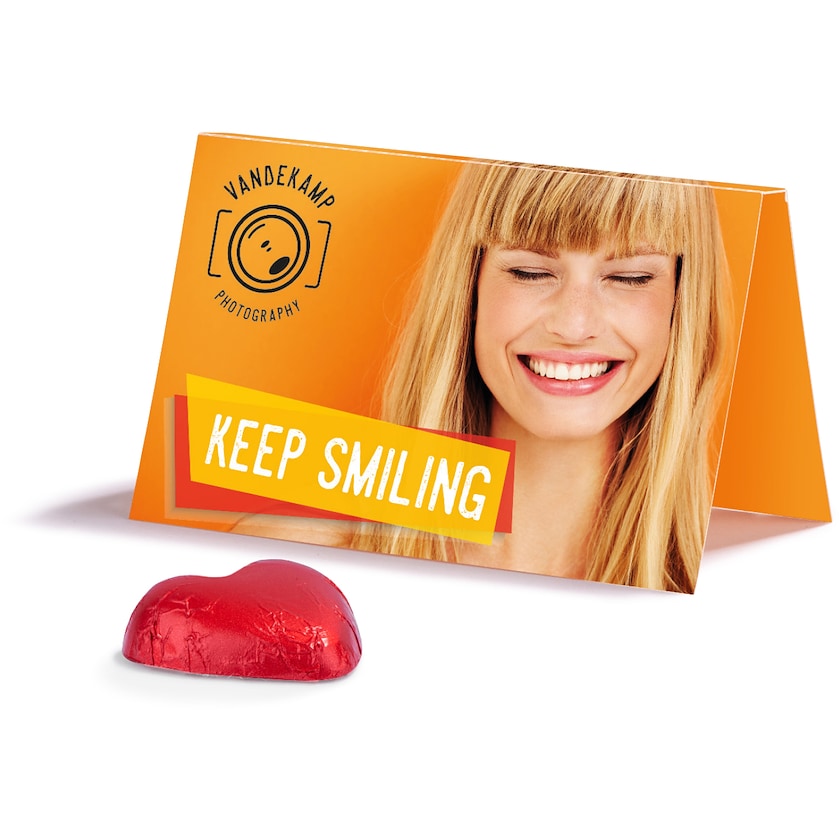 Machen Sie Werbung mit Herz! Karte mit einem in roter Folie verpackten Schokoladenherz. Beide Seiten der Karte werden komplett nach Ihren Wünschen bedruckt. Die Karte ist perforiert, sodass ein Teil beispielsweise eine Visitenkarte oder ein Rabattgutschein sein kann.