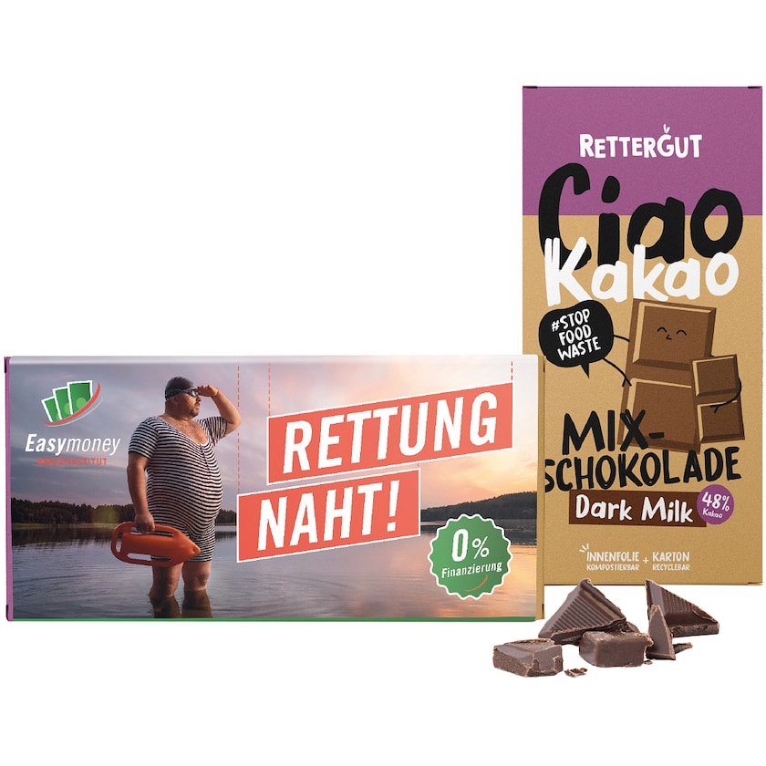 Schokoladentafel von Rettergut aus 100% recycelter Schokolade. Die Schokolade ist aus der vorherigen Schokoladenproduktion übrig geblieben und wäre sonst verloren gegangen. Die gesamte Produktion ist klimaneutral und kohlendioxidneutral. Ihr Druck wird auf einem Banner platziert, das um die Originalverpackung von Rettergut gewickelt wird.