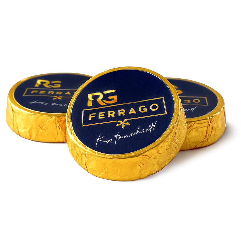 Rundes Schokoladenstück in Goldfolie. Gedruckt wird auf ein Etikett, das an der Oberseite platziert wird. Die Schokolade hat 60% Kakaogehalt und ist von höchster Qualität.