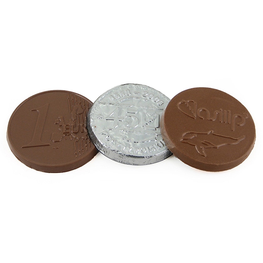 Große Schokomünzen. Ihr Logo wird direkt auf die Schokolade geprägt. Die Schokomünzen sind aus feinster belgischer Schokolade. Sie können zwischen Silber- oder Goldfolie wählen.