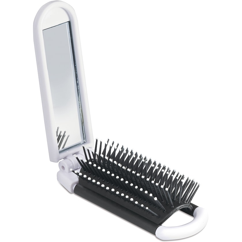 Faltbare Haarbürste mit Kunststoffspiegel. Zusammengeklappt nimmt die Bürste nur minimalen Platz ein.