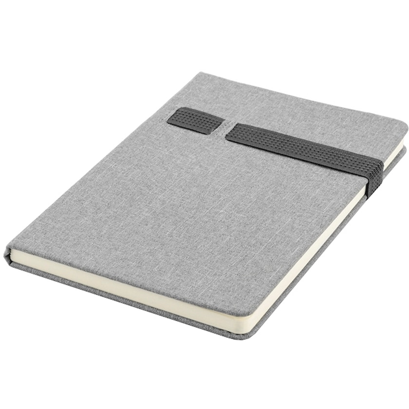 Schreibblock mit Gummizug z.B. zum Befestigen von Handy und Stift. Der Umschlag ist aus einem Gewebe, das an Leinen erinnert. Im Inneren gibt es 80 liniierte Seiten.