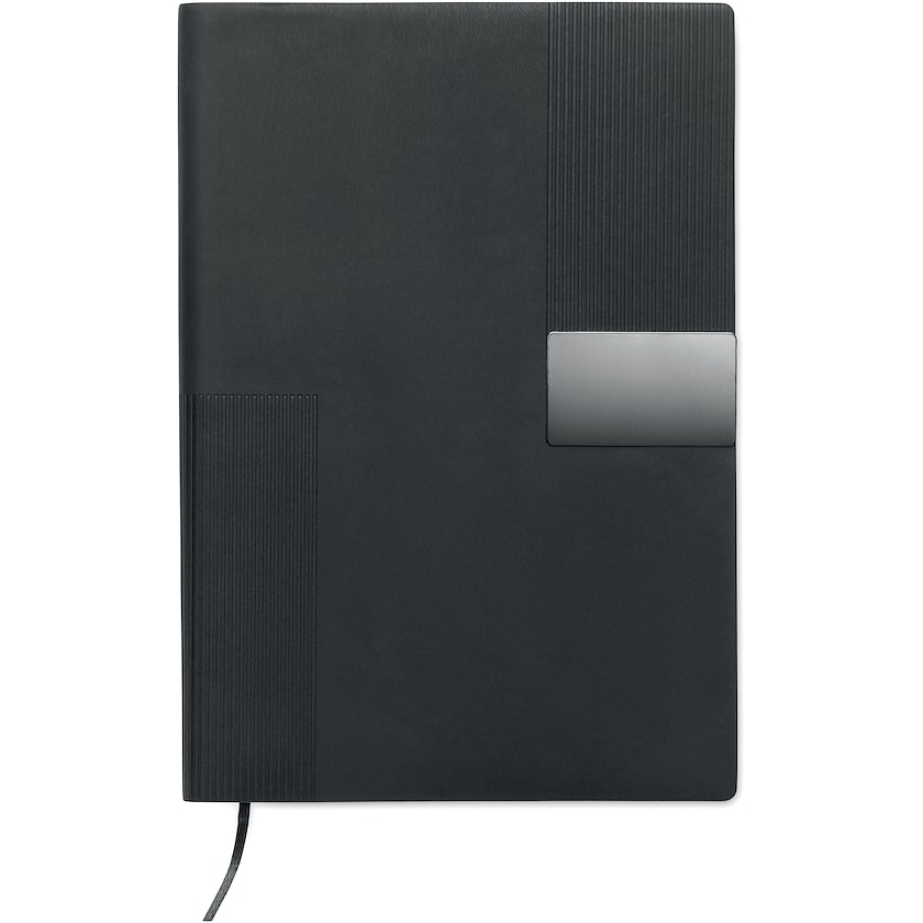 Notizbuch mit weichem Einband. Der Einband besteht aus 160 Seiten recyceltem Papier. Auf der Vorderseite befindet sich eine Metallplakette mit Platz für eine Lasergravur.